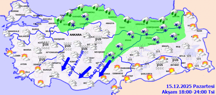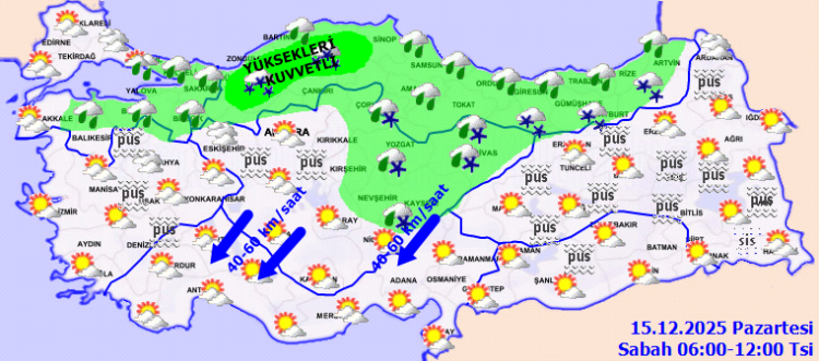 Kıyı kesimlerde yağmur ve sağanak yağışlı, iç kesimlerde karla karışık yağmurlu ve yer yer kar şeklinde beklenen yağışların Batı Karadeniz’in yükseklerinde yer yer kuvvetli kar şeklinde olması bekleniyor.